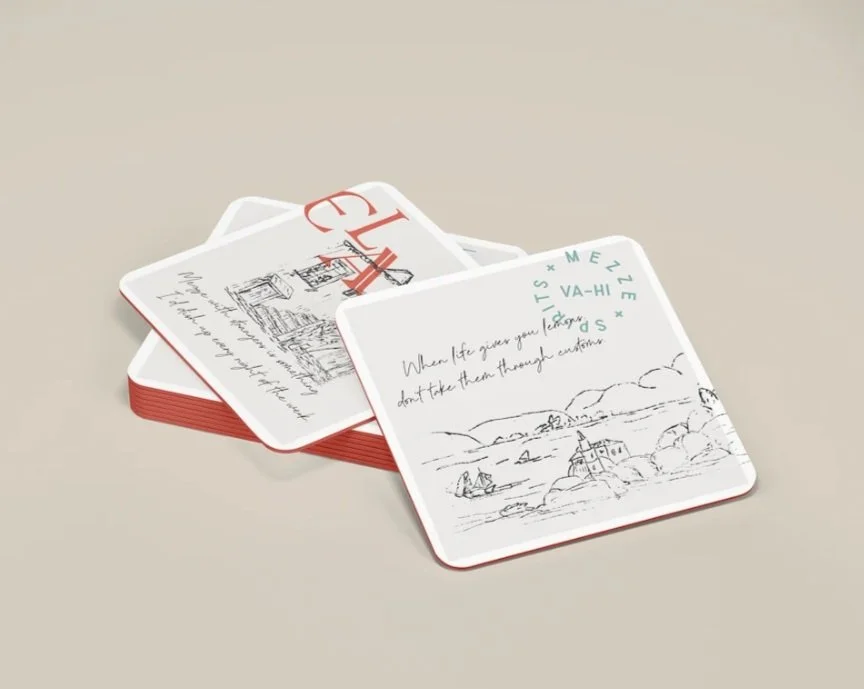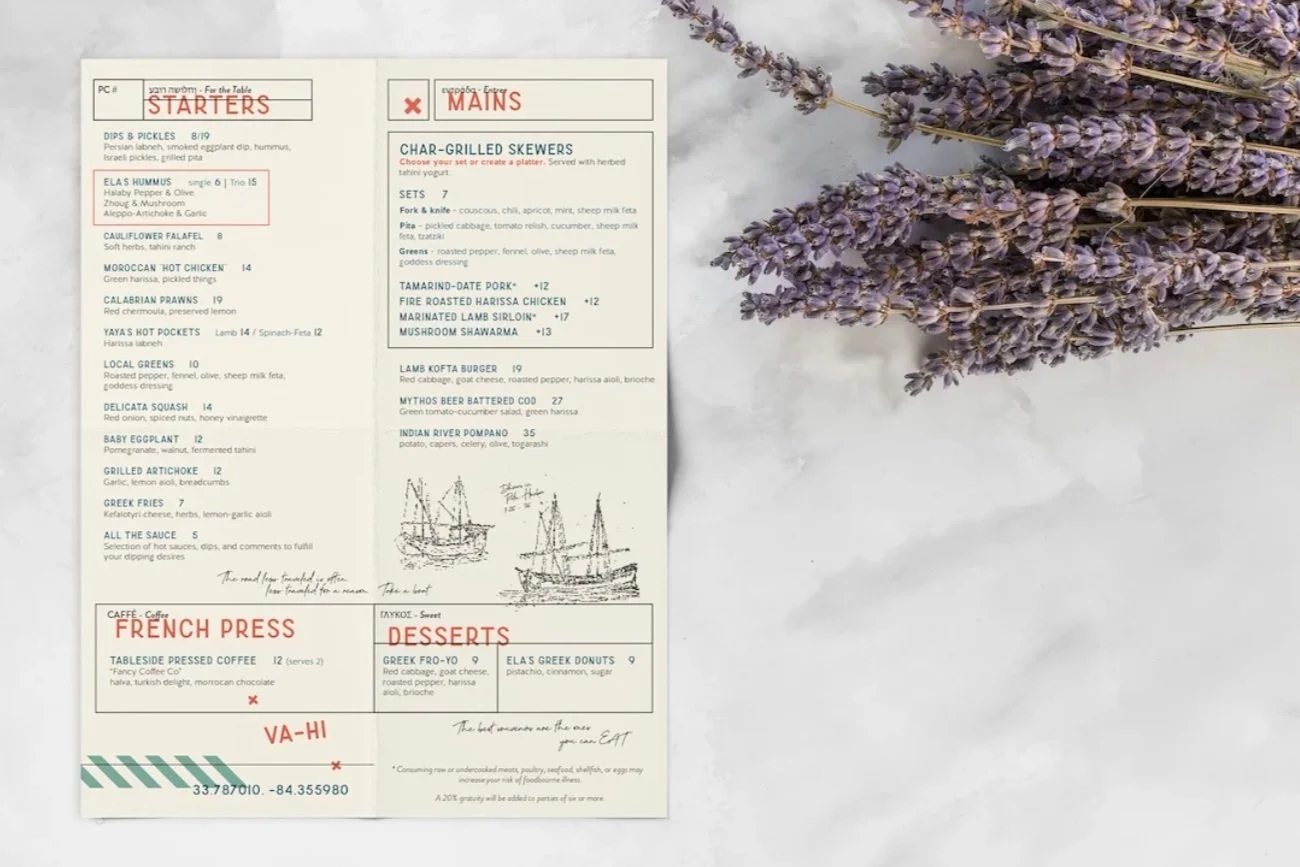When Fifth Group Restaurants asked to help shape the identity of it’s new Mediterranean restaurant concept, we didn’t just brand a space—we bottled a breeze, translated centuries of culinary diplomacy, and stitched it all into an aesthetic that winks, lingers, and maybe smells faintly of wild sumac. In the vibrant center of Atlanta’s Va-Hi, Ela Mezze + Spirits isn’t just a restaurant—it’s a Mediterranean daydream in edible form. We set out to create a mezze-fueled mirage where chickpeas philosophize and shellfish gets flirty. Each bite is a passport stamp, kissed with the spice of a thousand trade winds, swirling from Morocco’s honeycombed alleyways to the lemon-lit hills of the Levant—and just when you think you've landed, it sends you waltzing backward through time, barefoot, full of wine and questions.